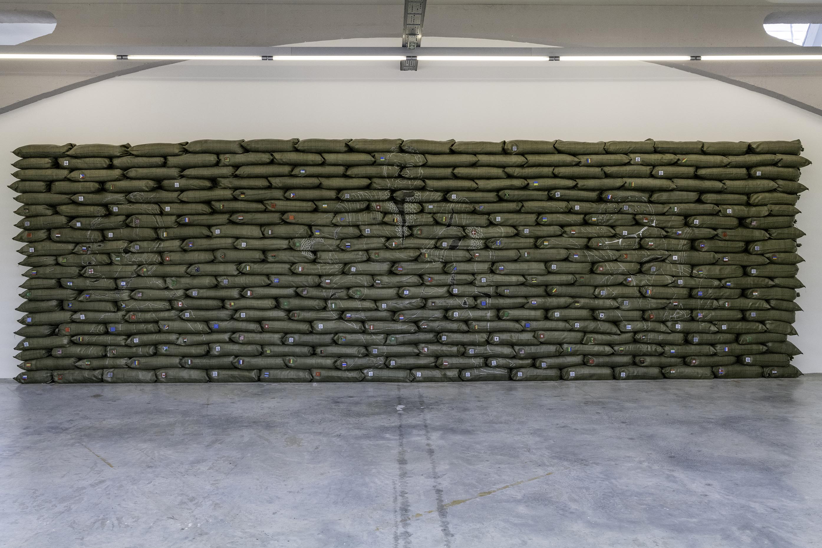 Vue de l'exposition "Destins Communs" - Omar Ba, 2023 © La Kunsthalle Mulhouse - photo : JJ Delattre Huile et Tipp-ex sur sacs en polypropylène tissé