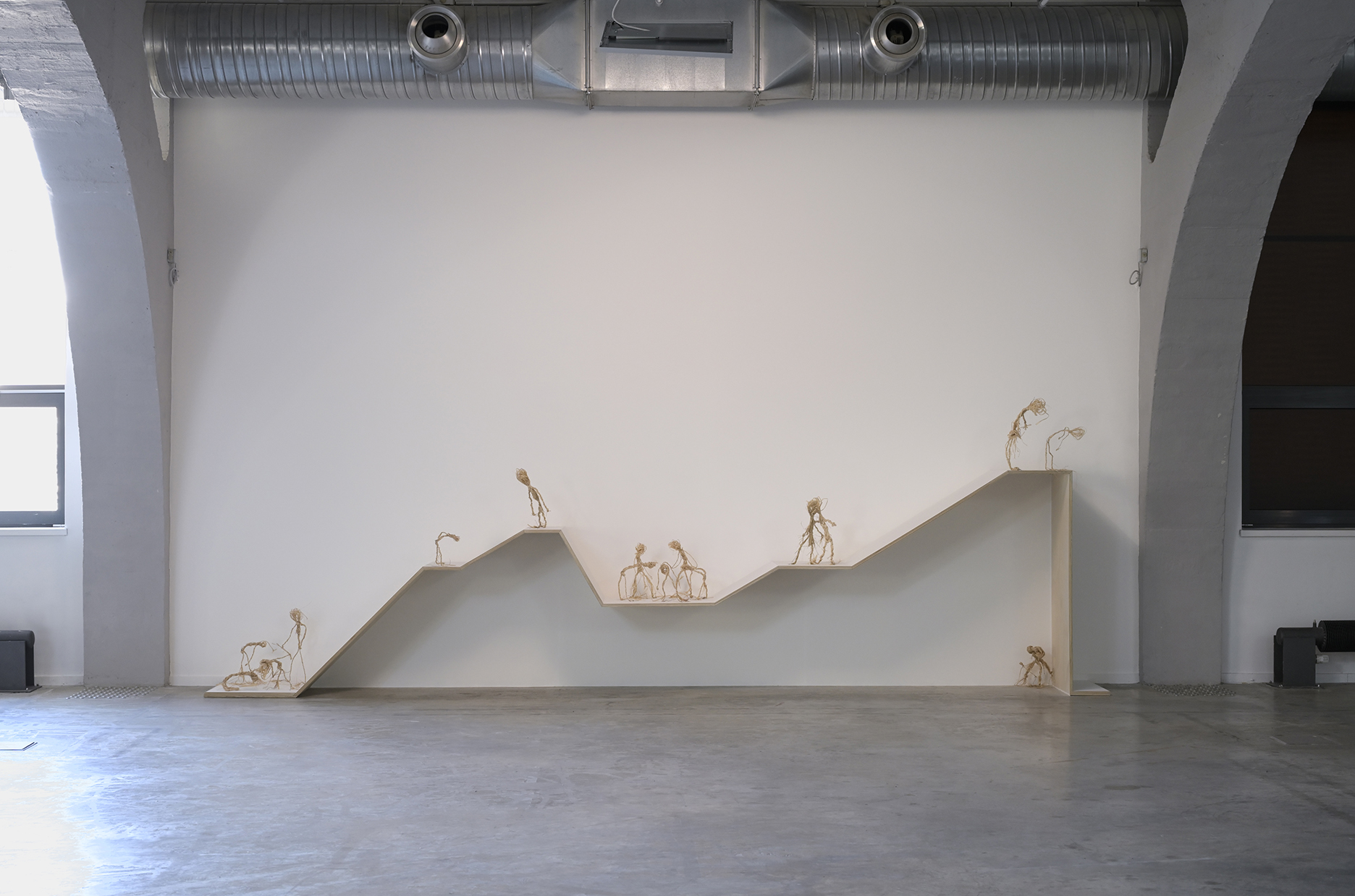 Structure de bois accueillant dix-neuf sculptures en paille et fil de fer, lumière ; 500 x 120 x 60 cm